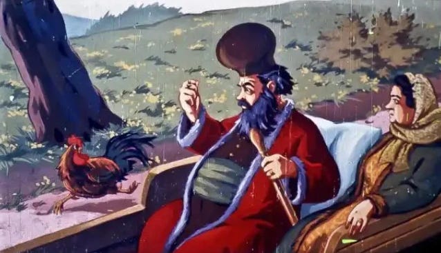 As the story goes, once upon a time there was an old man and an old woman. He had a Rooster and she had a hen. The hen laid eggs, and the woman wouldn’t share with the man. This hints at current feminism as being just another echo of a long and ancient feud. The split is marked here by the sterility of the hen’s eggs, that end up being eaten by the old woman, never getting a chance to pass into a living thing. Guenon speaks of this, alluding this Amazonian subversion originated before the demise of Atlantis, but that’s a story for another time. The Rooster gets beaten, but still won’t lay eggs so he goes on a journey. He finds this “two coins in a sack” on the road and then a respectable business man with his lady companions passes by and snatches the sack from the Rooster.