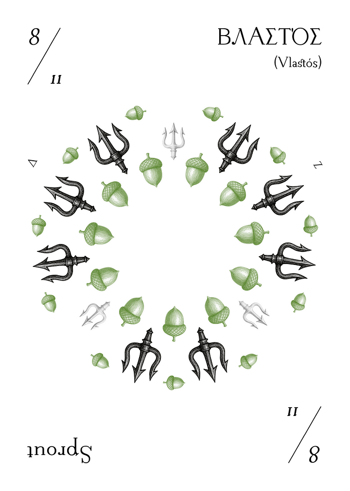 In Coliere V1 this is ΒΛΑΣΤΌΣ, Sprout, E(8,11), [x . xxx . xxx . x] appropriately. Growing from water. Just like Chloris from Oceanus. Unstoppable. Coming through. Each and every year, again and again.